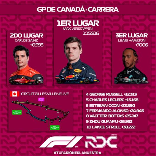 Tras una lucha constante con Carlos Sainz el neerlandés Max Verstappen se sube a lo más alto del podio en el #CanadianGP y afianza su liderato en el mundial de pilotos, el británico Lewis Hamilton completa el podio el segundo en este año.