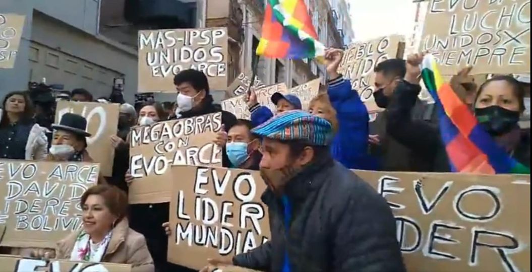 Al grito de “Evo y Arce un solo corazón” y con carteles de apoyo, ciudadanos esperan el arribo de Evo Morales a la Casa Grande del Pueblo, donde sostendrá una reunión con el presidente Luis Arce.