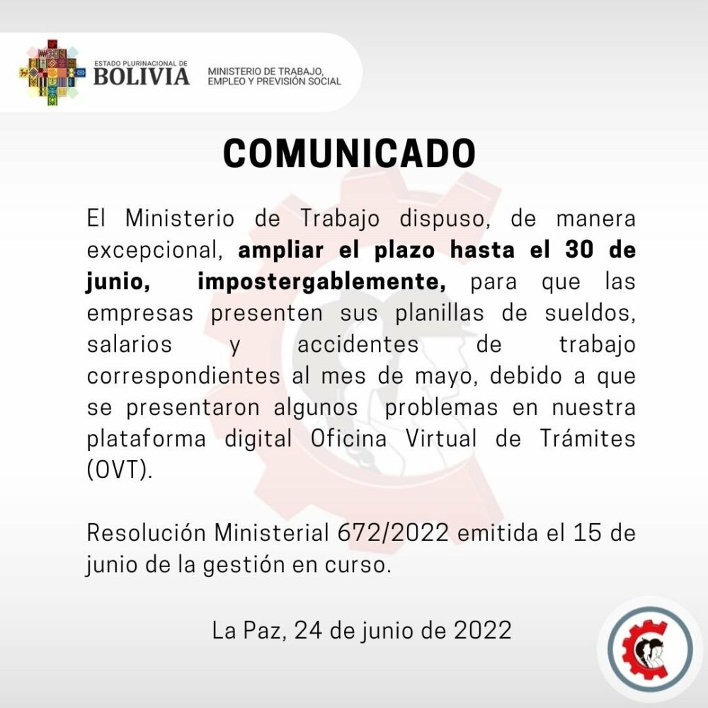 🔵 #ANF | #Sociedad El Ministerio de Trabajo comunica que de forma excepcional se dispuso ampliar hasta el 30 de junio el plazo para que las empresas presenten las planillas de sueldo y salarios correspondientes a mayo. https://t.co/RDTRdteYk5