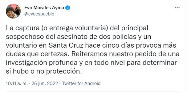 🔵#ANF | #Política El expresidente Evo Morales afirmó que la entre voluntaria o captura de Misael Nallar, principal responsable del asesinato de tres policías, deja más dudas que certezas. https://t.co/tMwaqgF2mu