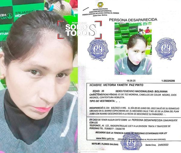 Victoria Yanethe Paz Pinto de 35 años, esta desaparecida desde el pasado 9 de Junio, salió de su casa en el barrio Copacabana en el Plan 3.000 y no retornó, la mujer es madre de 3 hijos, sus familiares piden ayuda para encontrarla.