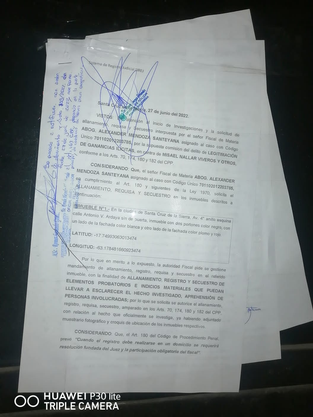 La Fuerza Especial de Lucha Contra el Crimen, división anticorrupción junto al Ministerio Público, llegaron hasta un domicilio ubicado en el cuarto anillo, Av. Cristo Redentor y radial 27, donde se realizó un allanamiento siguiendo la investigación por legitimación de ganancias ilícitas en contra de Misael Nallar. El allamiento fue llevado a cabo por el fiscal Alexander Mendoza.
