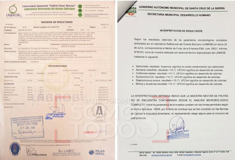 Estudio de laboratorio, certifica que jugo del desayuno escolar era apto para consumo humano.