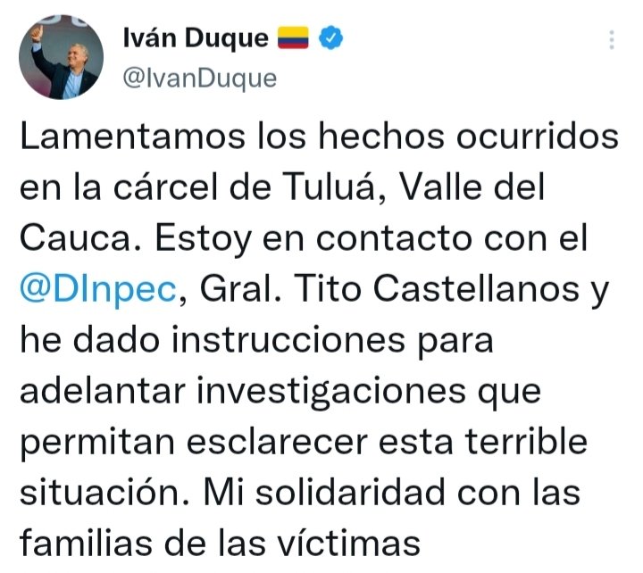 🔵 #ANF | #Internacional Al menos 49 reclusos fallecieron debido a un incendio registrado al interior de la cárcel de Tuluá, en el departamento del Valle del Cauca, #Colombia. El presidente Iván Duque lamentó el hecho y anunció una investigación para dar con los responsables. https://t.co/CM2n36V8pN