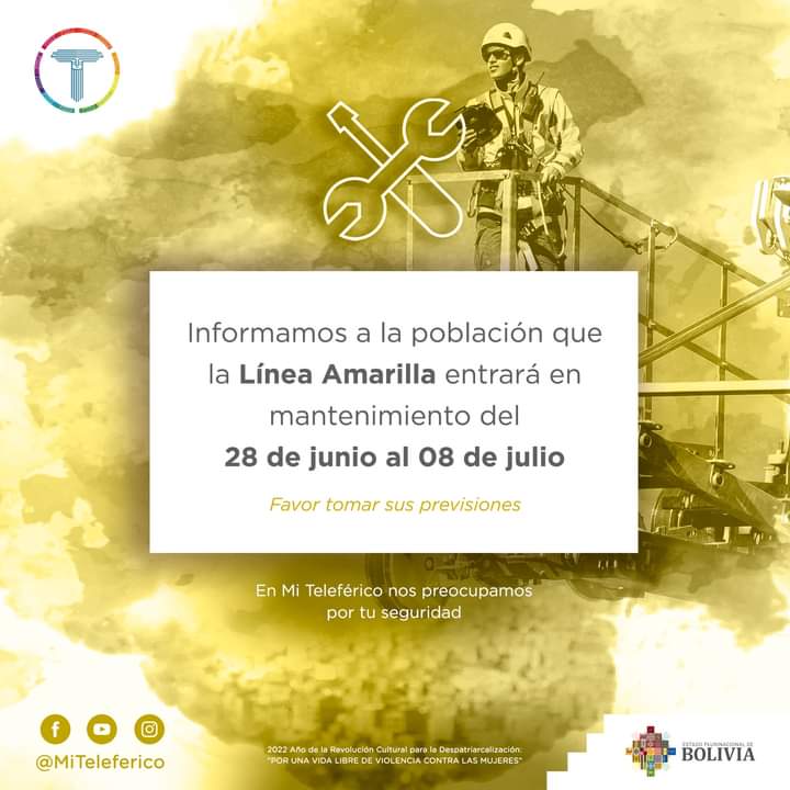 🔵 #ANF | La lĂnea amarilla de @miteleferico ingresa en una etapa de mantenimiento desde este martes 28 de junio hasta el prĂłximo 8 de julio. La empresa de transporte por cable pide a sus usuarios tomar previsiones. pic.twitter.com/2woVaOycMt