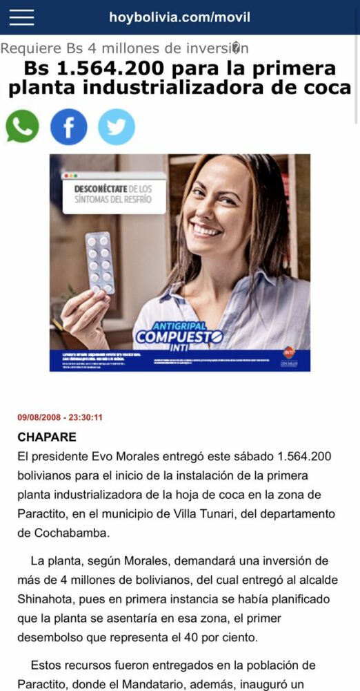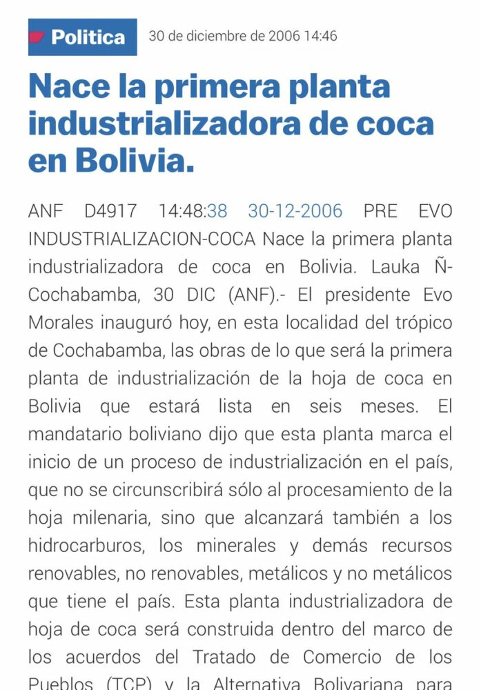 #Bolivia | Acaban de crear la primera planta industrializadora de hoja de coca por tercera o cuarta vez desde 2006. Ya lo van a lograr. https://t.co/jdtkE1vMk6