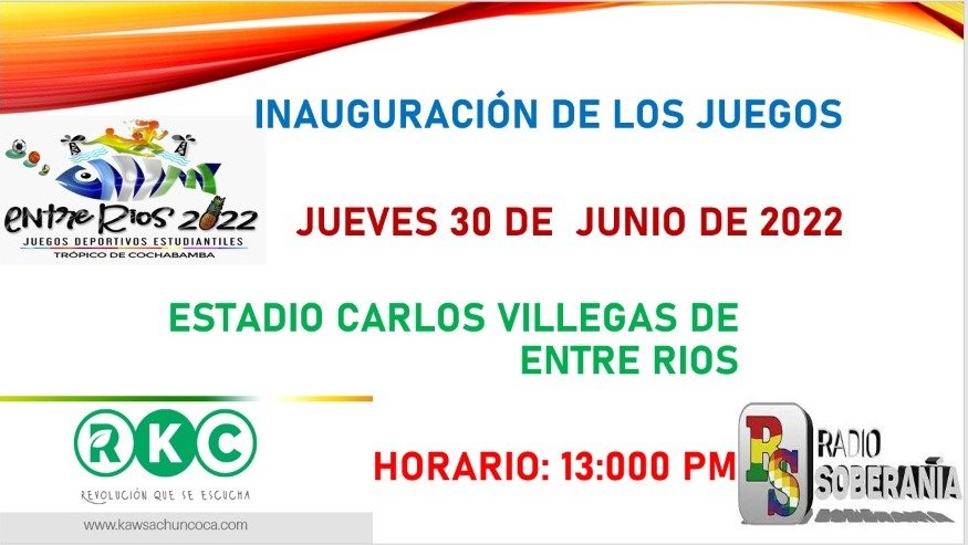 #RKC | La Coordinadora de las 6 Federaciones del Trópico de Cochabamba, la Mancomunidad de Municipios del Trópico, en coordinación con el Gobierno Municipal de Entre Ríos inauguran este jueves 30 de junio la 2da FASE JUEGOS ESTUDIANTILES TRÓPICO 2022 que se llevara en el estadio nuevo, Carlos Villegas.