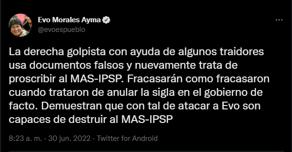 🔵 #ANF | El expresidente Evo Morales asegura que «la derecha y algunos traidores usan documentos falsos con el objetivo de proscribir al MAS-IPSP» y dice que con tal de atacar a Evo son capaces de destruir a su propio partido. https://t.co/5CSvBfRVcn