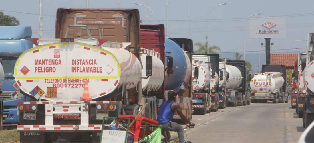 Una larga fila de camiones cisternas se observa la mañana de este jueves en la zona de la Refinería de Palmasola, en la capital cruceña, donde los choferes buscan cargar el carburante para luego distribuirlo en las distintas estaciones de servicio.