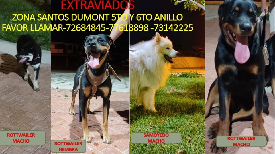 Dos mascotas se extraviaron la madrugada de ayer por la zona Santos Dumont entre 5to y 6to anillo son de razas; Samoyedo y Rottweiler.