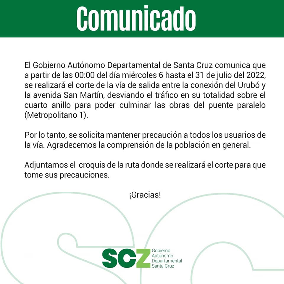 «A partir de las 00:00 del día miércoles 6 hasta el 31 de julio del 2022, se realizará el corte de la vía de salida entre la conexión del Urubó y la avenida San Martín, desviando el tráfico en su totalidad sobre el