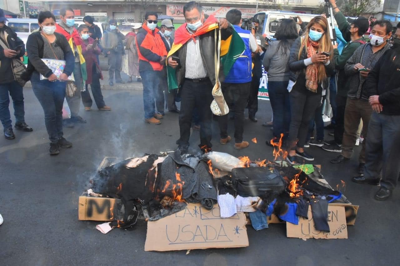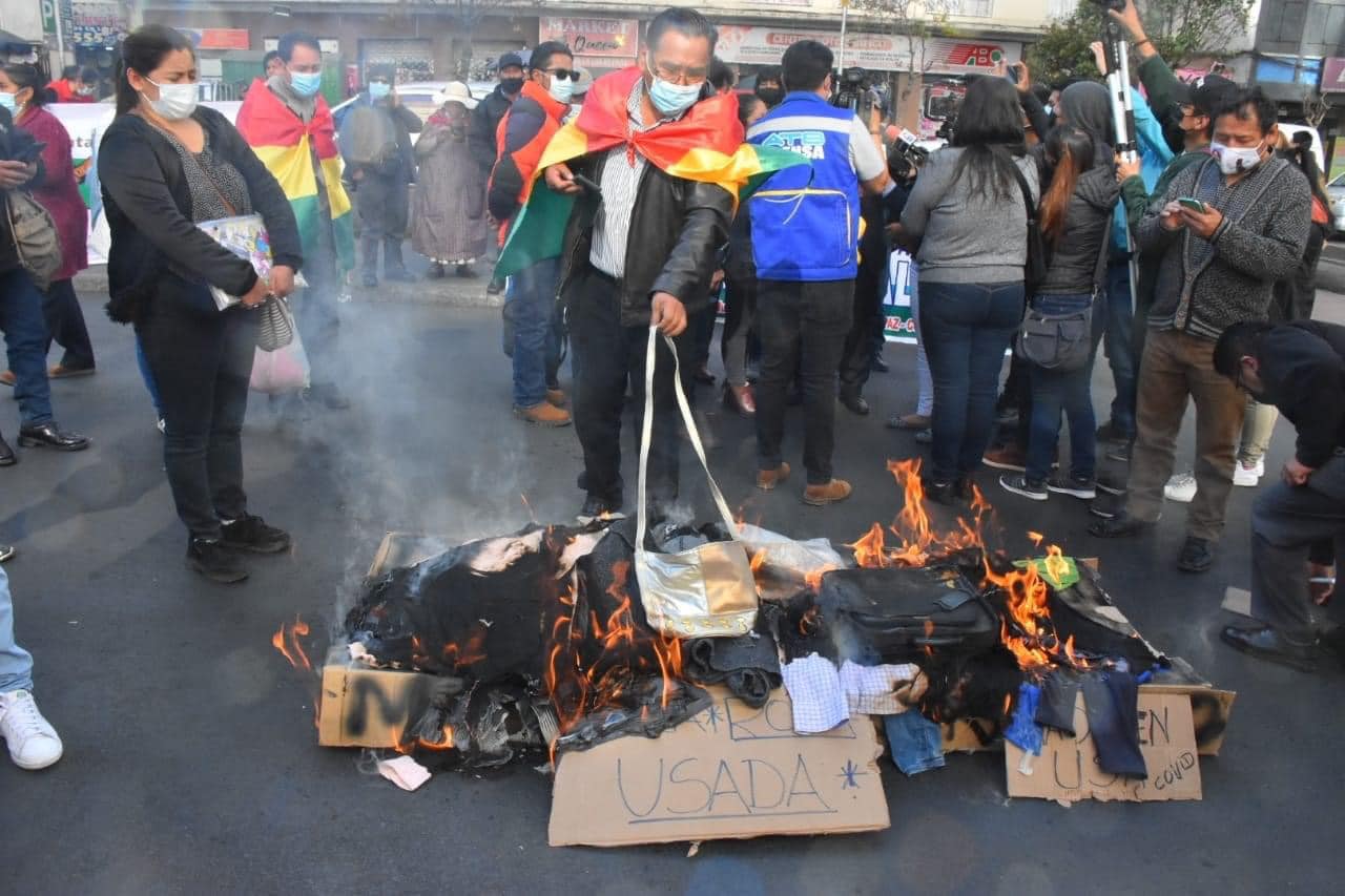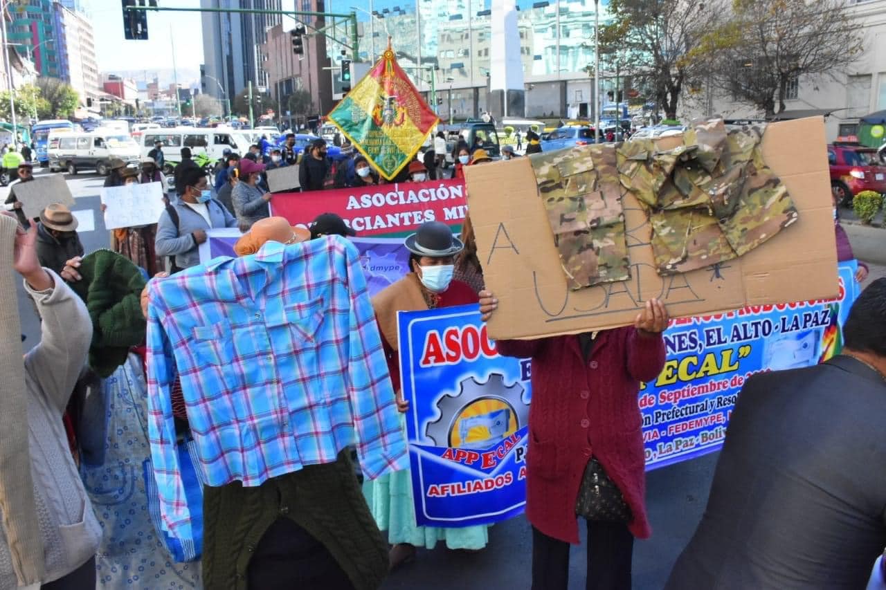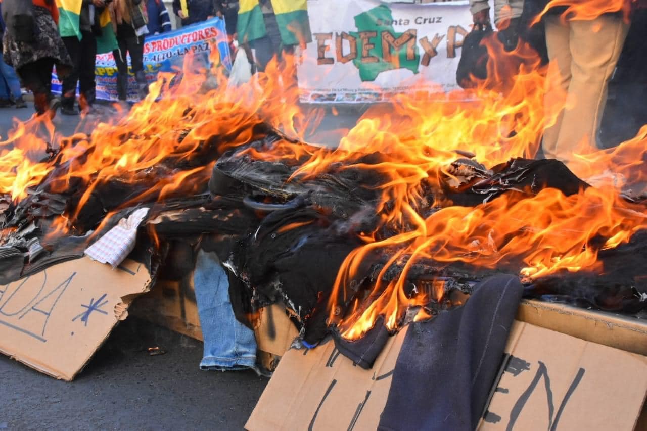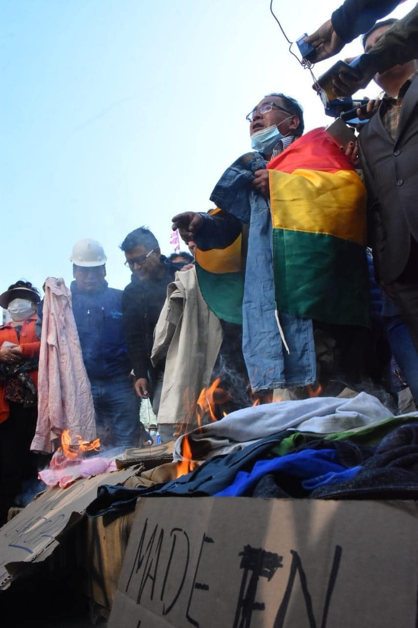 Integrantes de la Asociación de Pequeños Productores en Confecciones El Alto y La Paz quemaron este miércoles fardos de ropa usada, exigen la prohibición de importación de ropa usada y pide al Gobierno tomar acciones y atender sus demandas.