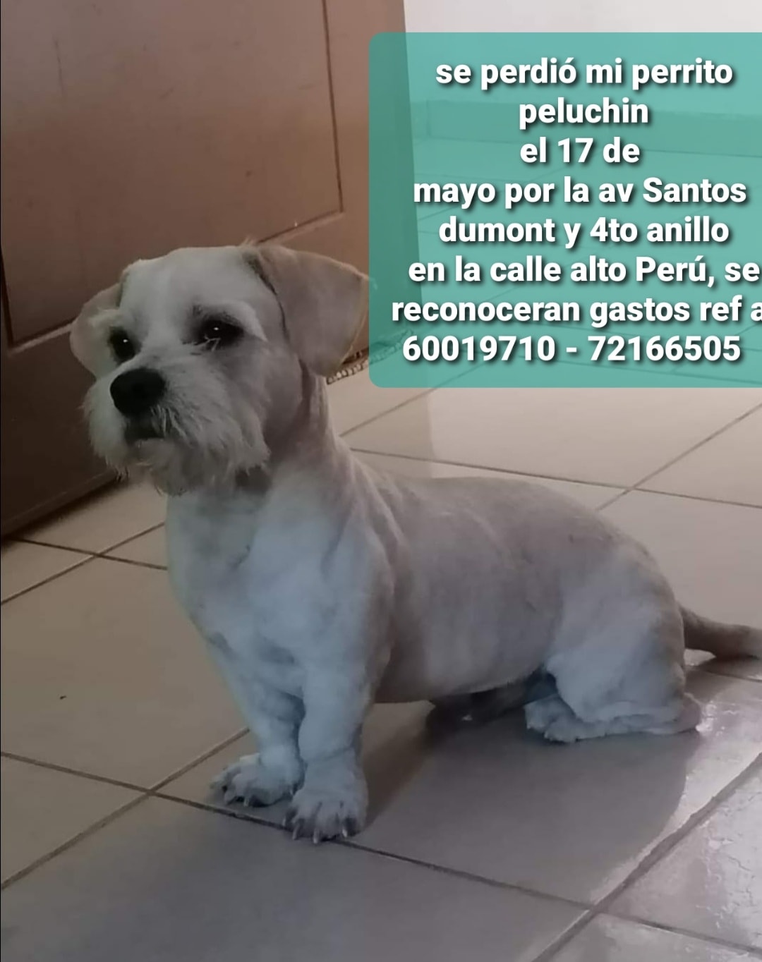 Buscan a peluchin, una mascota que se extravió por la zona de la Santo Dumot y 4to anillo en la C/ Perú.