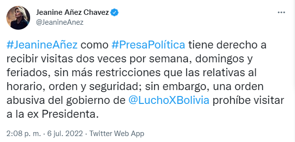 🔵#ANF | La expresidenta Jeanine Añez denunció que por "una orden abusiva del gobierno de Luis Arce" le prohíben visitas. Régimen Penitenciario explica que debido a la quinta ola de contagios se tomaron medidas preventivas y que la expresidenta sí recibe visitas de sus hijos. pic.twitter.com/22Ll6Uo5Zd
