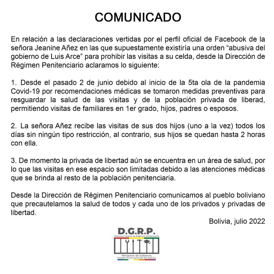 🔵#ANF | La expresidenta Jeanine Añez denunció que por «una orden abusiva del gobierno de Luis Arce» le prohíben visitas. Régimen Penitenciario explica que debido a la quinta ola de contagios se tomaron medidas preventivas y que la expresidenta sí recibe visitas de sus hijos. https://t.co/22Ll6Uo5Zd
