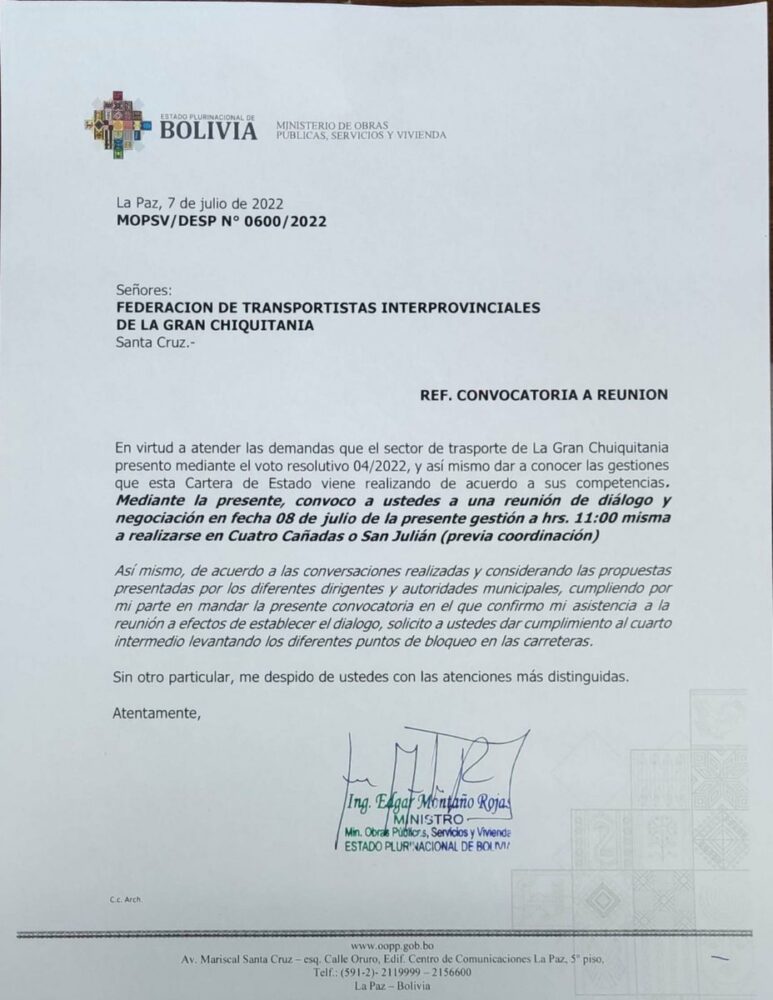🔵 #ANF | El ministro de Obras Públicas, Edgar Montaño, convoca a una reunión de diálogo al sector de transporte interprovincial de la Chiquitania para este viernes 8 de julio a las 11:00 a realizarse en Cuatro Cañadas o San Julián. https://t.co/Jy3wXbRqm9