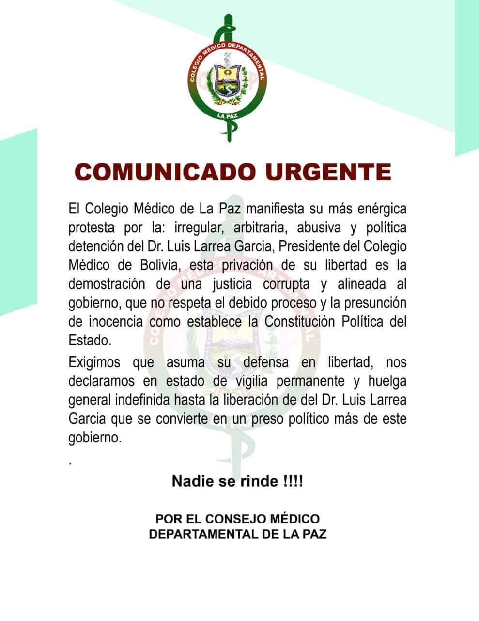 El Colegio Médico de La Paz exigió que el doctor Luis Larrea se defienda en libertad y se declaró en estado de vigilia permanente y huelga general indefinida hasta su liberación.