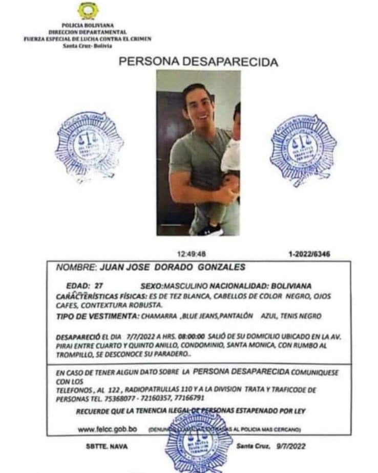 Según la denuncia, la última vez que Dorado fue visto por su familia fue el pasado jueves a las 8:00. El joven salió de su domicilio, en el condominio Santa Mónica, ubicado en la avenida Piraí entre cuarto y quinto anillo, para dirigirse a El Trompillo, y desde ahí perdieron contacto con él.