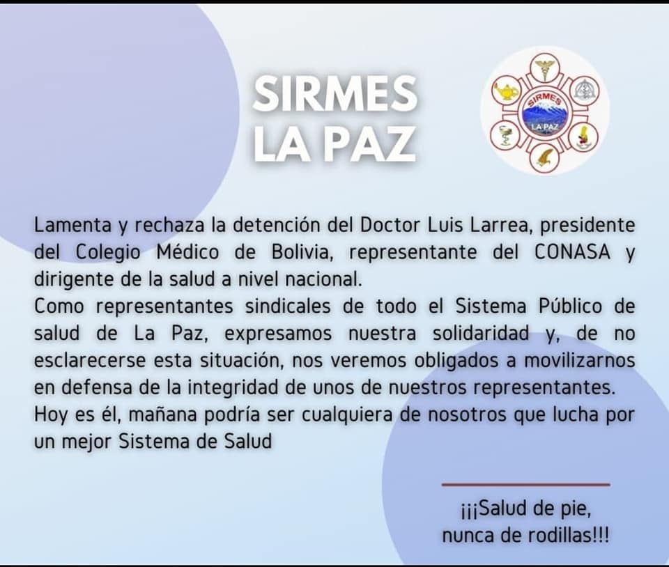 El Sirmes La Paz expresó su rechazo y solidaridad por la aprehensión del doctor Luis Larrea. Advirtieron que en caso de no esclarecerse esta situación se verán obligados a movilizarse.