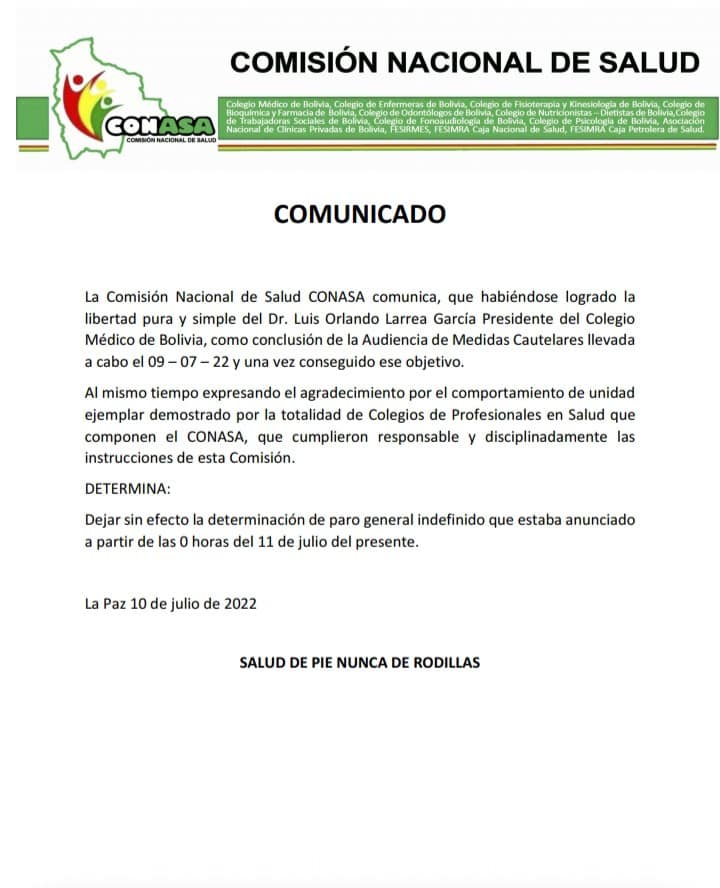 #Conasa y #ColegioMédicoDeBolivia suspenden paro anunciado para este lunes