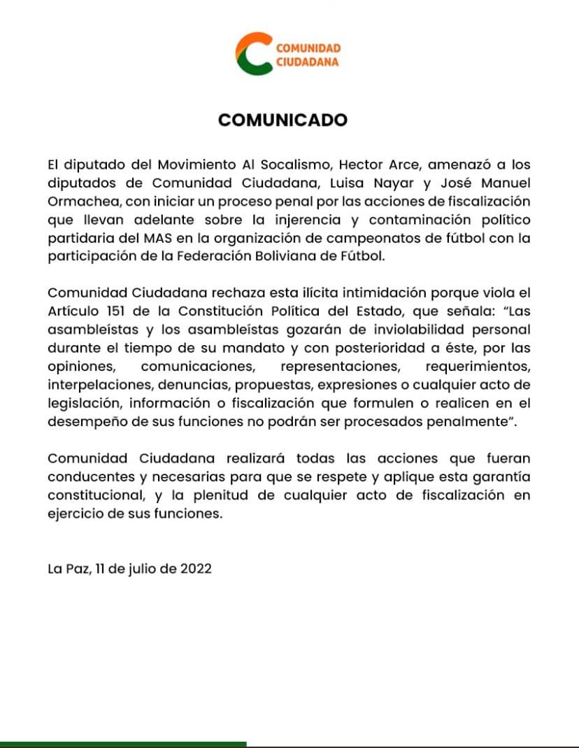 Comunidad Ciudadana expresó su respaldo de los diputados Luisa Nayar y Manuel Ormachea ante amenazas de ser procesados por el diputado del MAS, Héctor Arce.