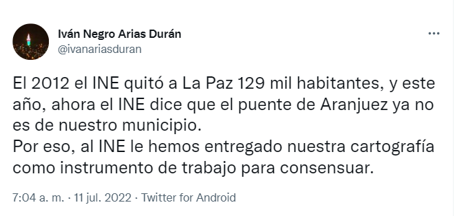 🔵 #ANF | El alcalde Iván Arias dice que el INE le quitó a #LaPaz 129 mil habitantes en 2012 y que este año afirma que el puente Aranjuez ya no es parte del municipio paceño. https://t.co/DrJcycGxNH
