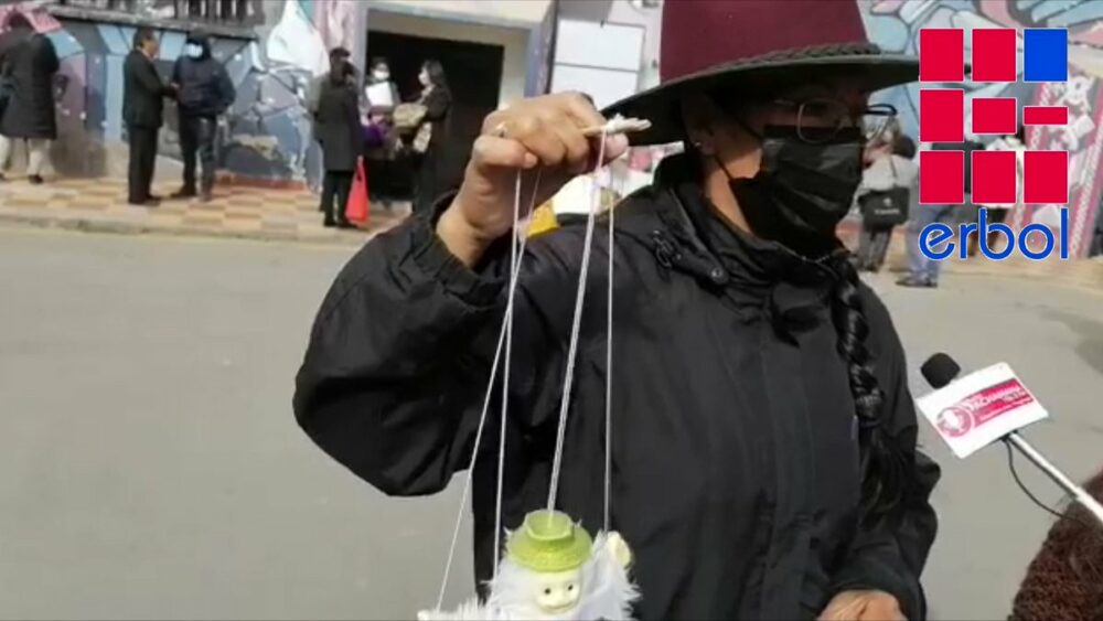 La activista alteña Guadalupe Daza muestra una marioneta con la imagen del viceministro de Defensa del Consumidor, Jorge Silva. Le recrimina no defender a la población frente a la facturación electrónica en servicios. pic.twitter.com/bxJSZmB5T5