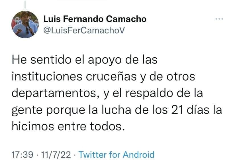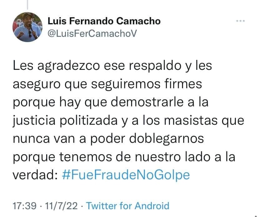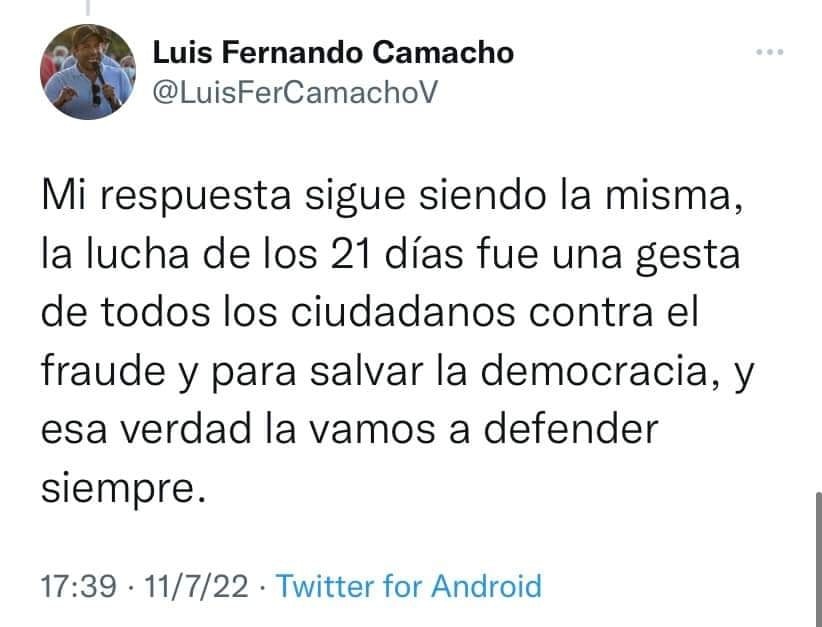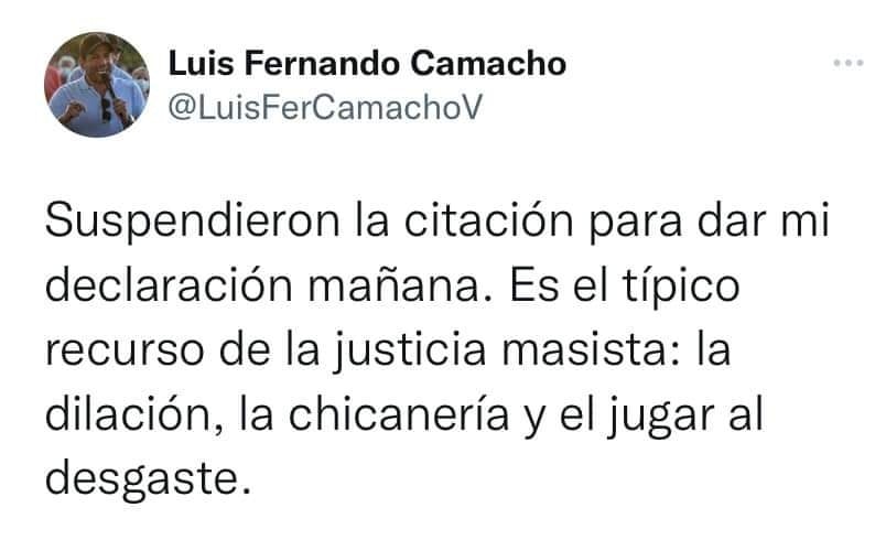 La respuesta de Luis Fernando Camacho en redes después de la suspensión de su declaración que estaba programada para este martes.