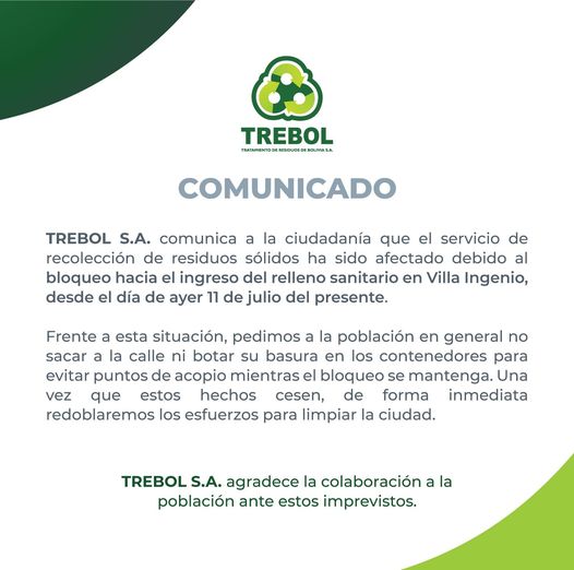 La empresa Trebol informó que su trabajo fue interrumpido por un bloqueo al ingreso del relleno sanitario de Villa Ingenio en El Alto. La empresa pidió a la población no sacar su basura hasta que haya una solución.