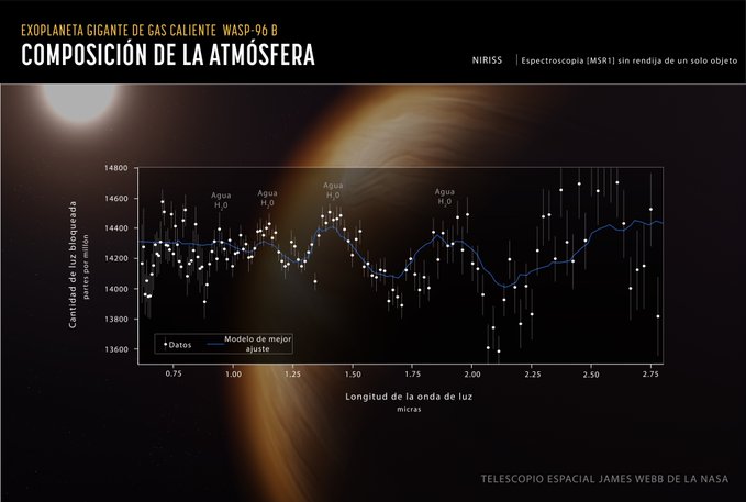 🔵#ANF | #Ciencia Nubes en otro mundo. El #TelescopioEspacialJamesWebb captó la señal de agua en el planeta gaseoso gigante WASP 96-b que orbita una estrella a 1.150 años luz de distancia. Por primera vez, se ve evidencia de nubes en la atmósfera de este exoplaneta. (Vía NASA) https://t.co/W4PZqvon3z