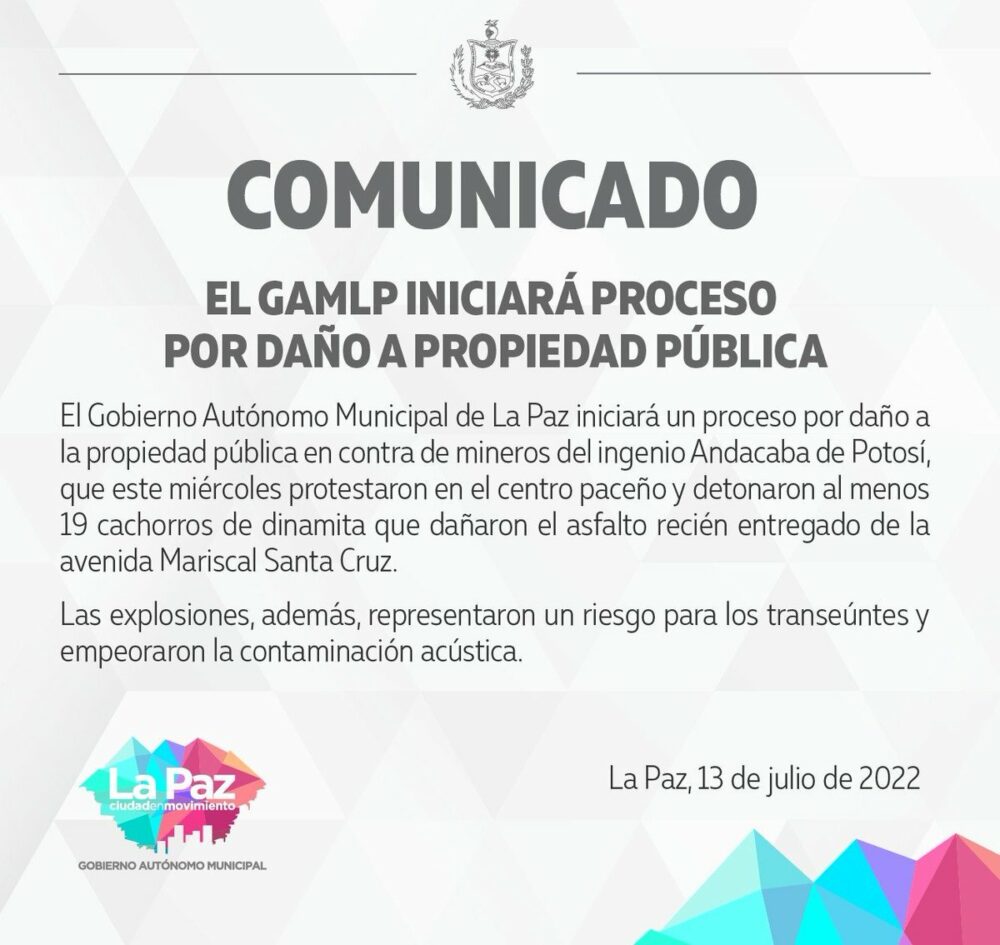 🔵 #ANF | #Sociedad La Alcaldía paceña anuncia que asumirá acciones legales contra los mineros del ingenio Andacaba de #Potosí por dañar el asfalto de la avenida Mariscal Santa Cruz con la detonación de dinamitas. pic.twitter.com/vFkFIesta2