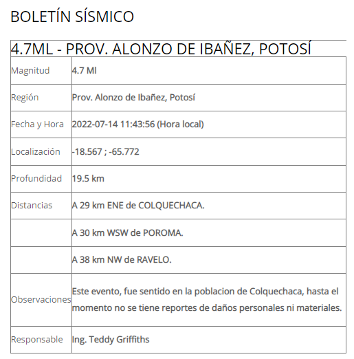 🔵#Ultimo | El Observatorio San Calixto reporta que a las 11.34 de hoy se registró un #sismo de magnitud 4.7 Ml, a una profundidad hipocentral de 19.5 km (sismo superficial). El epicentro fue localizado en la provincia Alonzo de Ibáñez del departamento de #Potosí. pic.twitter.com/TRU4uSY9lj