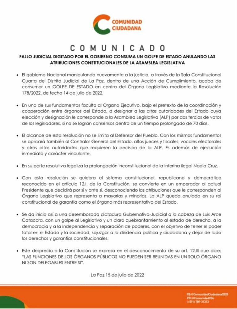 🔵 #ANF | #Política Comunidad Ciudadana denuncia golpe de Estado contra la Asamblea Legislativa, luego que la Sala Constitucional Cuarta de #LaPaz facultaría al presidente Luis Arce designar al nuevo Defensor del Pueblo. https://t.co/3TNmb9b0w8