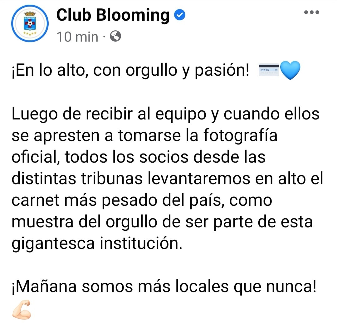 El club #Blooming, pide que sus hinchas, luego de recibir al equipo, levanten su carnet, de socio.