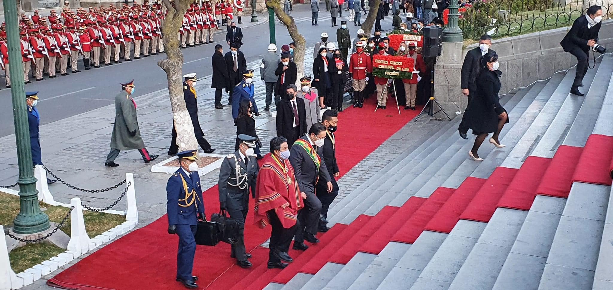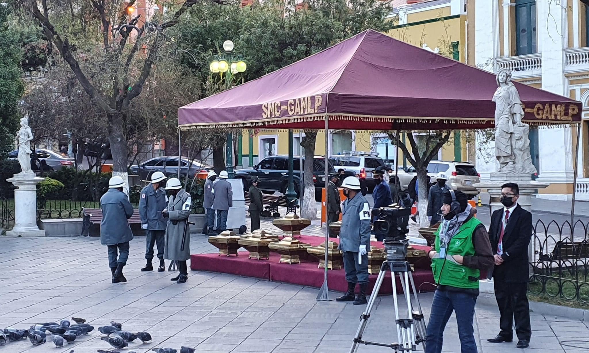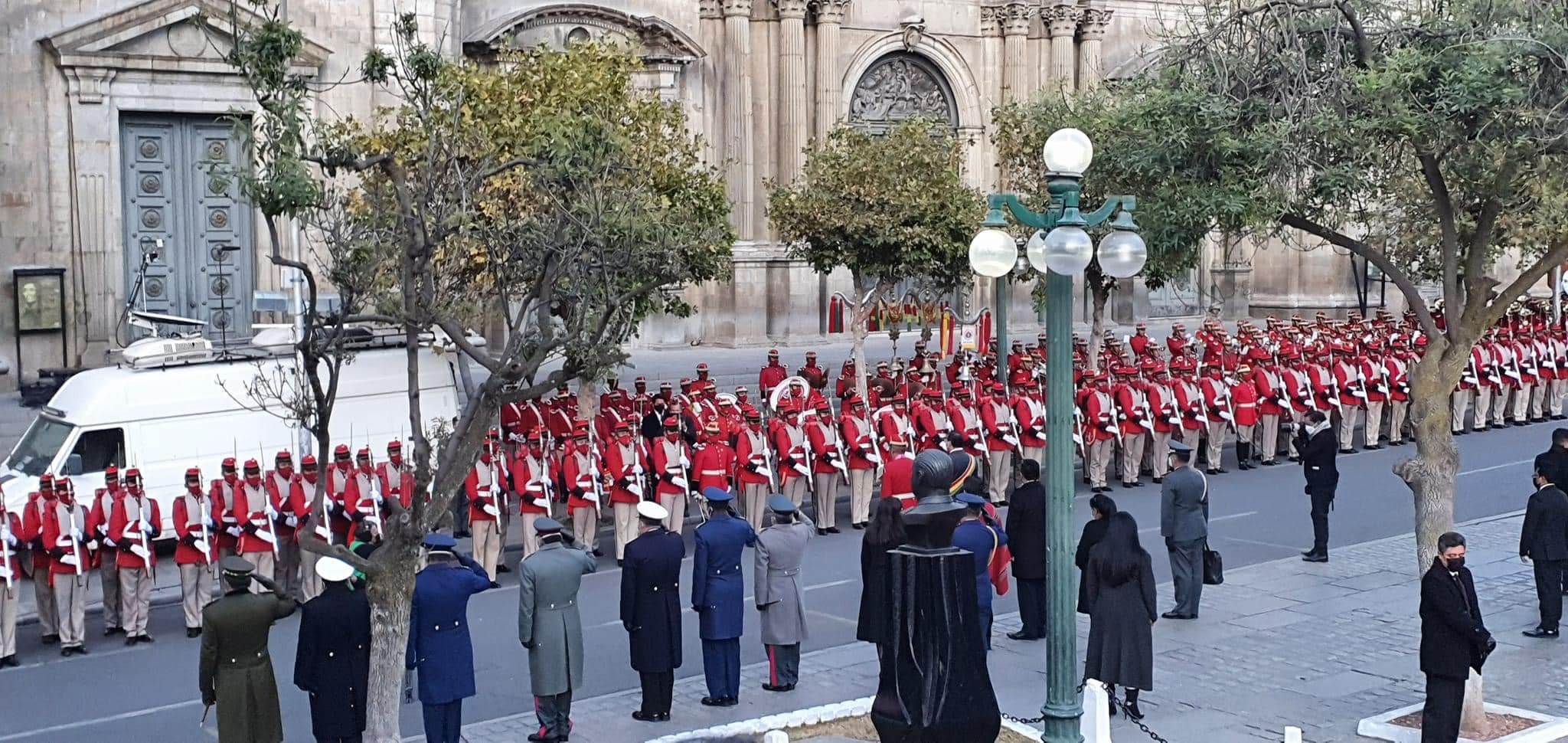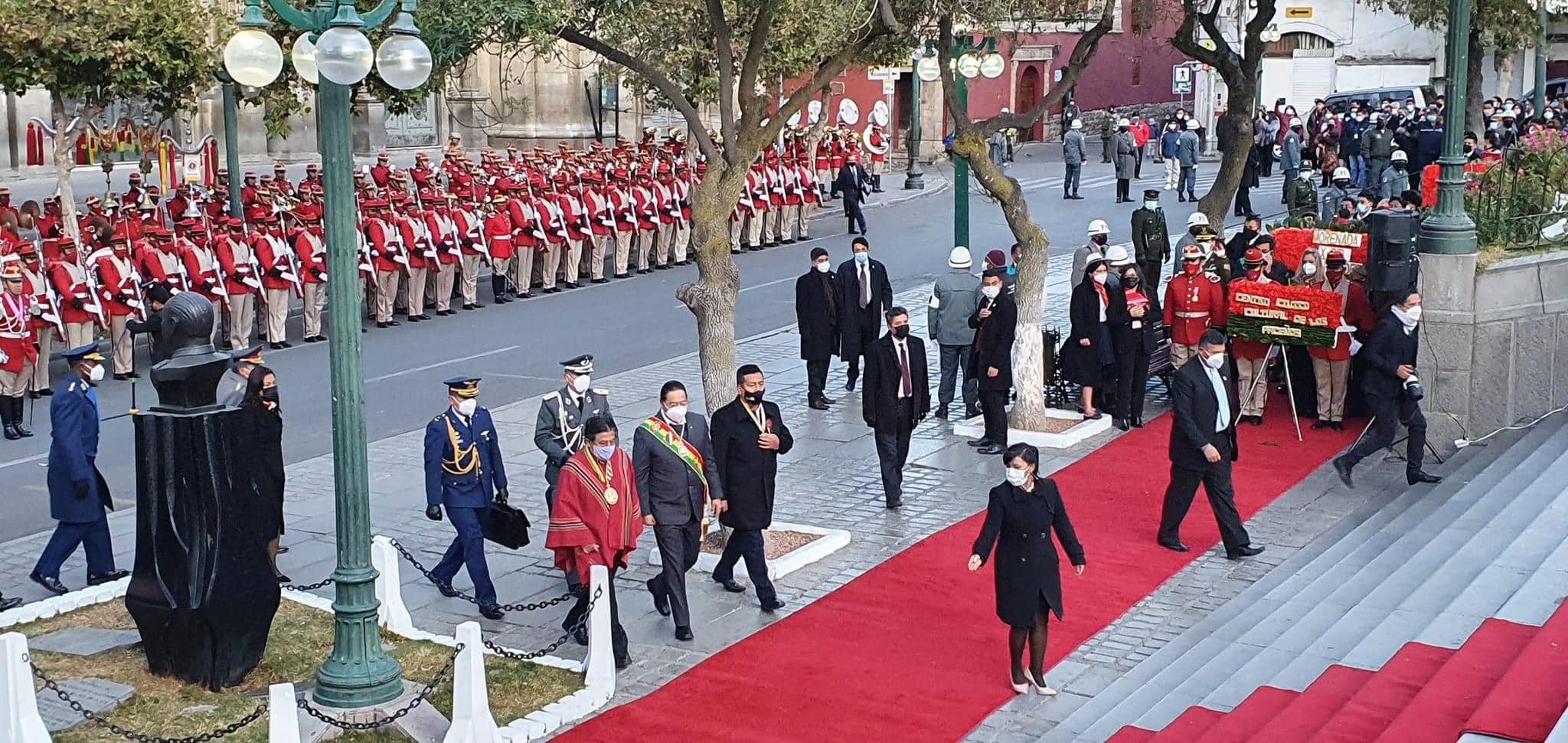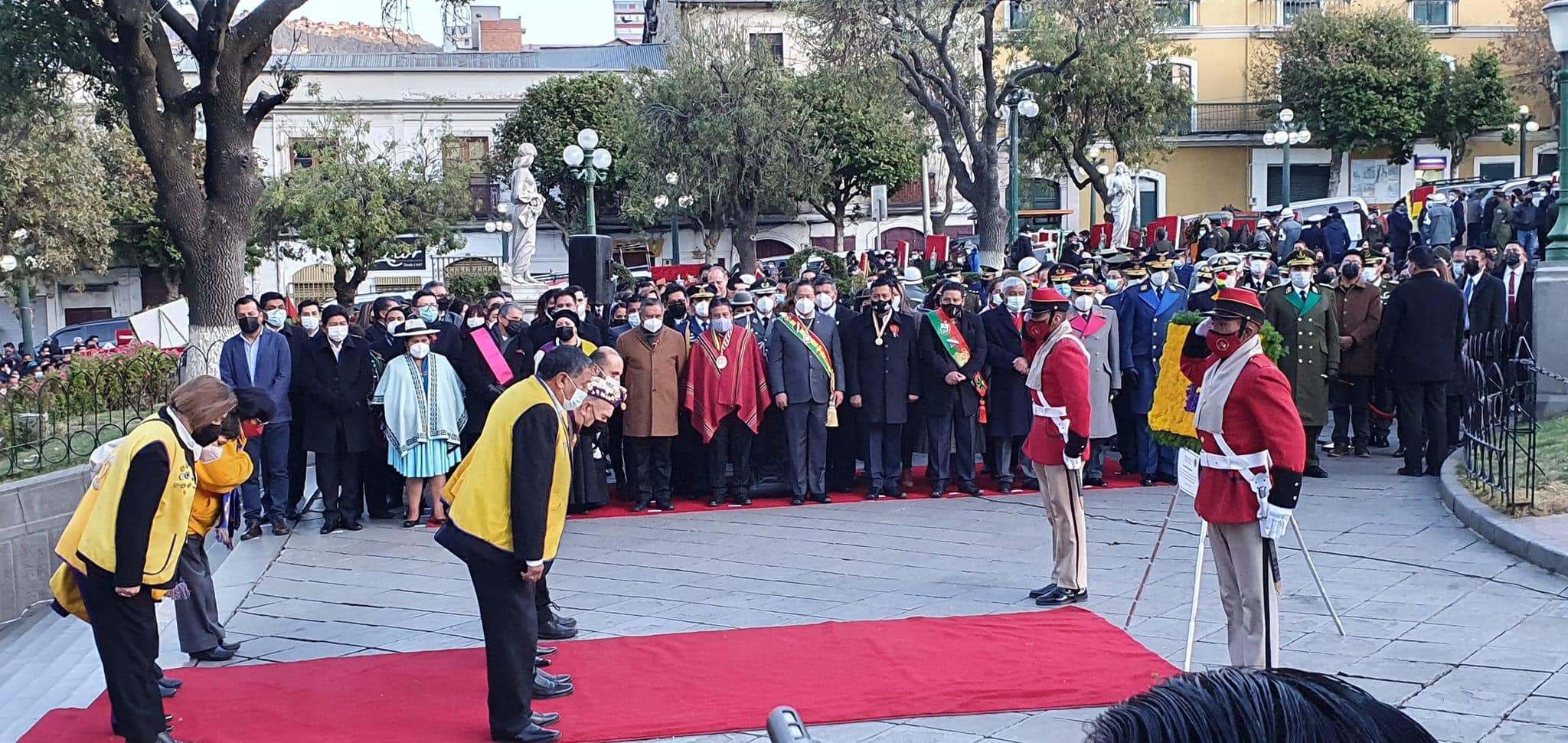 El Presidente, Luis Arce Catacora, Vicepresidente David Choquehuanca y autoridades de Estado participan del acto de ofrenda floral en conmemoración a los 213 años de la Gesta Libertaria del departamento de La Paz.