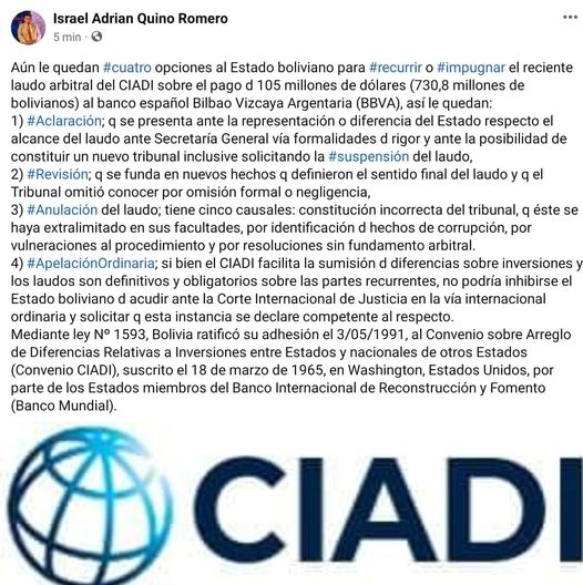 #IsraelQuino /// Aún le quedan #cuatro opciones al Estado boliviano para #recurrir o #impugnar el reciente laudo arbitral del CIADI sobre el pago d 105 millones de dólares (730,8 millones de bolivianos) al banco español Bilbao Vizcaya Argentaria (BBVA), así le quedan: 🧵 https://t.co/f9lNogG4mN