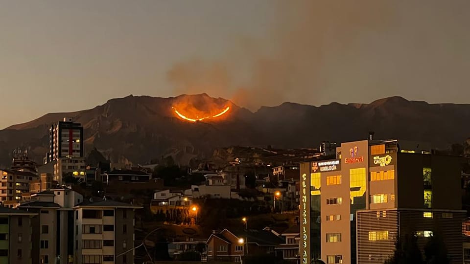 Incendio de magnitud en cerros cercanos a la zona de Achumani Al finalizar la tarde de este viernes se registró un incendio de magnitud en los cerros que rodean a la zona de Achumani en La Paz. 📷: Página Siete