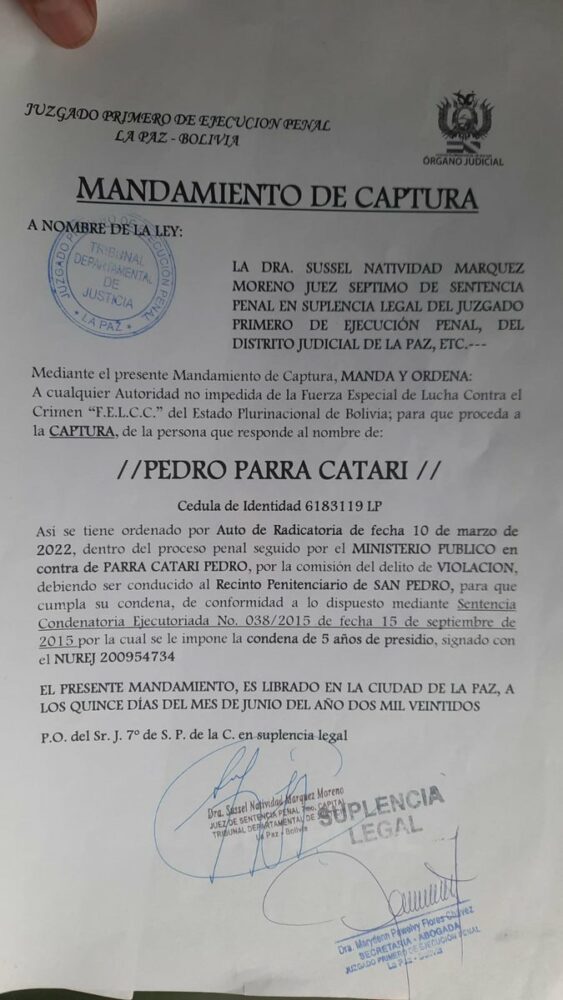 2/2…comunicamos al pueblo boliviano que se recapturó a una persona sentenciada por violación, Pedro Parra Catari en la ciudad de #LaPaz, quien fue sentenciado el año 2015 por la comisión de este delito.