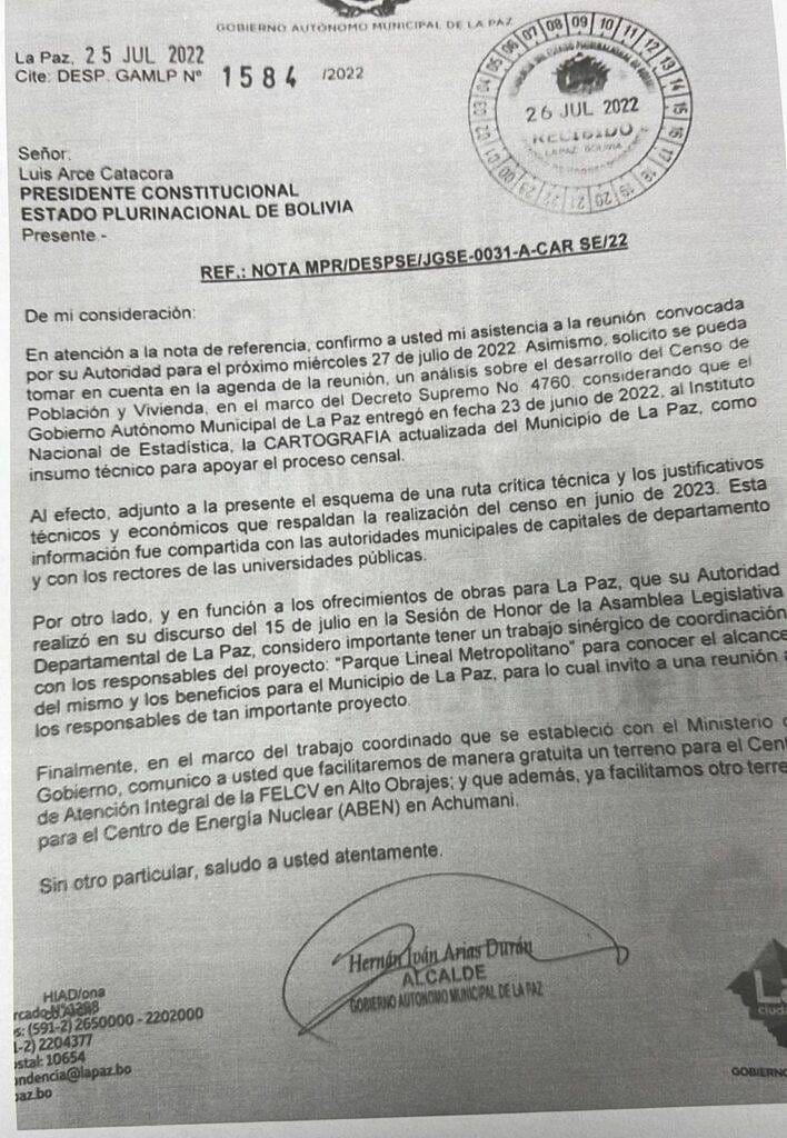 El alcalde de La Paz, Iván Arias, envió una nota al presidente Luis Arce, donde pidió que se incluya el tema del Censo en la reunión con alcaldes prevista para este miércoles.