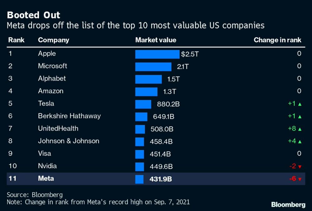 Facebook (Meta) ya no clasifica en el top 10 de las empresas más valoradas de Estados Unidos, pero no solo eso, sino que además queda muy por detrás de las tecnológicas. https://t.co/s6aztkjmCm