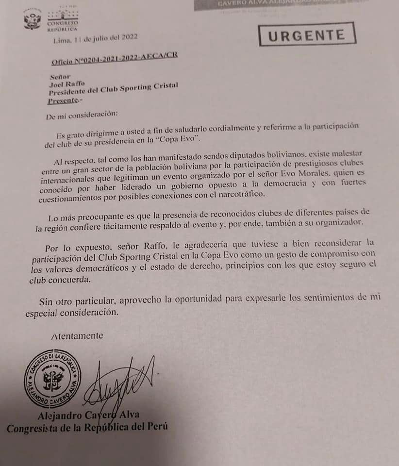 Un congresista de la derecha peruana pidió al club Sporting Cristal no jugar en la Copa Evo. Sporting Cristal lo ignoró y hoy llegaron a Villa Tunari.