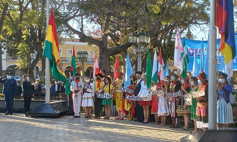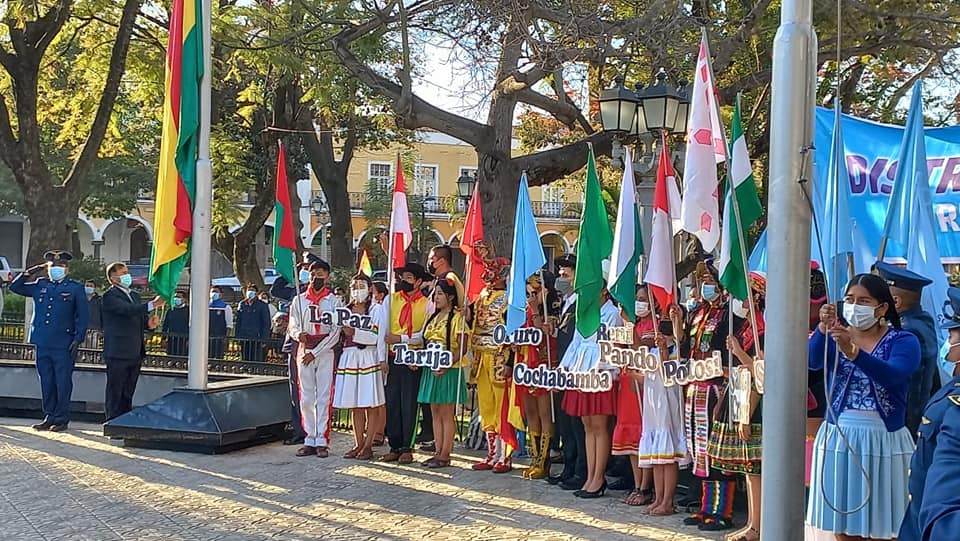 A la cabeza del gobernador Humberto Sánchez, con la iza de símbolos patrios se dá inicio a las actibidades de las #FiestasPatrias en la plaza 14 de Septiembre de Cochabamba.
