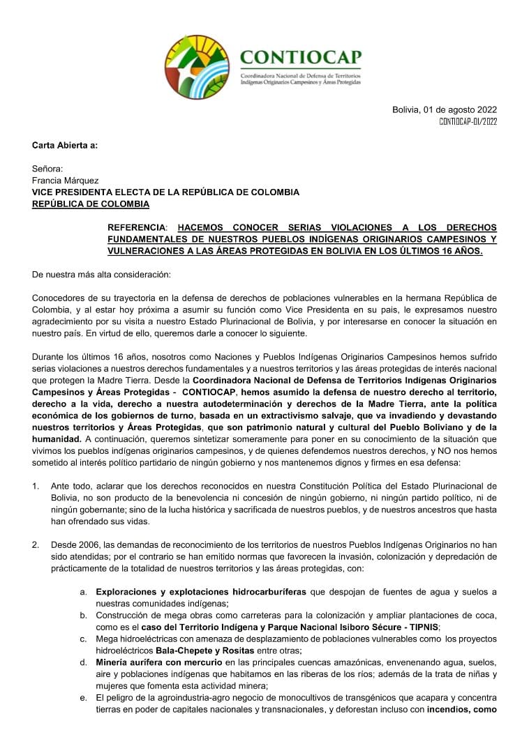La Coordinadora Nacional de Defensa de Territorios Indígenas Originarios Campesinos y Áreas Protegidas envió una carta a la vicepresidenta electa de Colombia, Francia Márquez, donde denunciaron serias violaciones a los derechos de los pueblos indígenas originarios campesinos y vulneraciones a las áreas protegidas de Bolivia en los últimos 16 años.