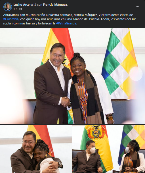 🔵 #ANF | El presidente @LuchoXBolivia se reunió con la vicepresidenta electa de #Colombia, Francia Márquez, en la Casa Grande del Pueblo. «Ahora, los vientos del sur soplan con más fuerza y fortalecen la #PatriaGrande», escribió el mandatario en su cuenta de Facebook. https://t.co/9eJcJK4HCO