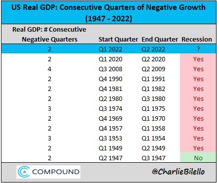 Muchos dicen que EEUU «no puede» estar en recesión porque el empleo sigue creciendo, pero las últimas 10 veces que EEUU tuvo 2 o más trimestres consecutivos de crecimiento negativo del PIB real, la economía estaba en recesión. Solo hubo una excepción: 1947. https://t.co/Jbq0GdDkRX