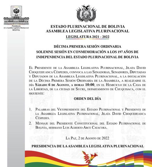 Sesión oficial en conmemoración a los 197 años de independencia de Bolivia se llevará a cabo el día sábado 6 de agosto en Sucre