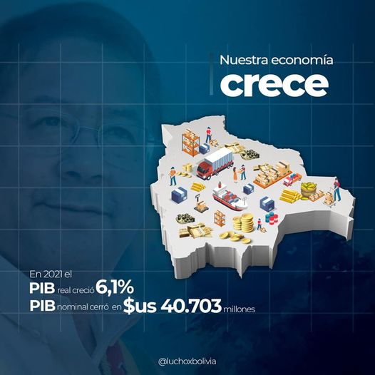 “En 2021, el PIB real creció 6,1%, respecto a 2020, y también el PIB nominal, cerrando en $us40.703 millones”, informó el primer mandatario Luis Arce Catacora a través de su cuenta oficial de twitter.