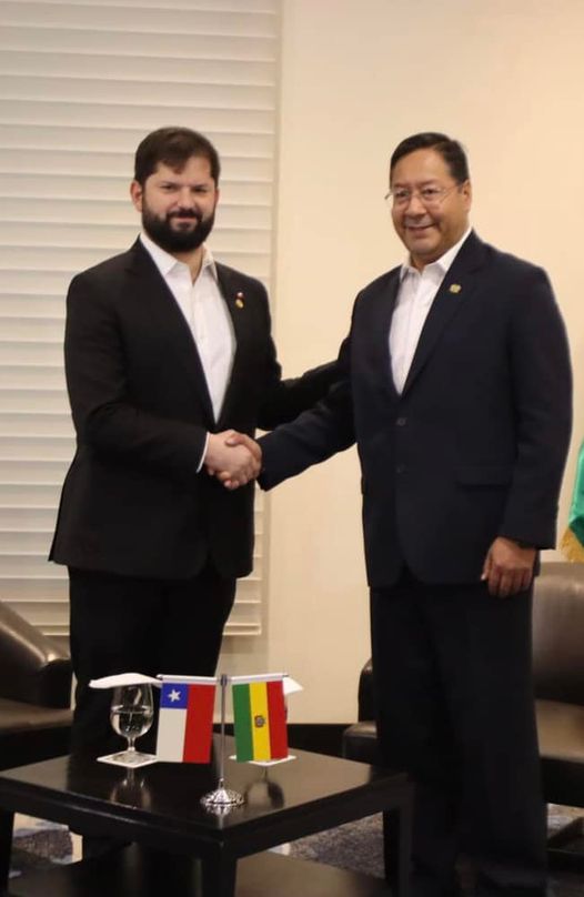 Gabriel Boric y Luis Arce. Chile y Bolivia. Asisten a la posesión de Gustavo Petro en Colombia. Y se dan un apretón de manos 🇨🇱 🇧🇴