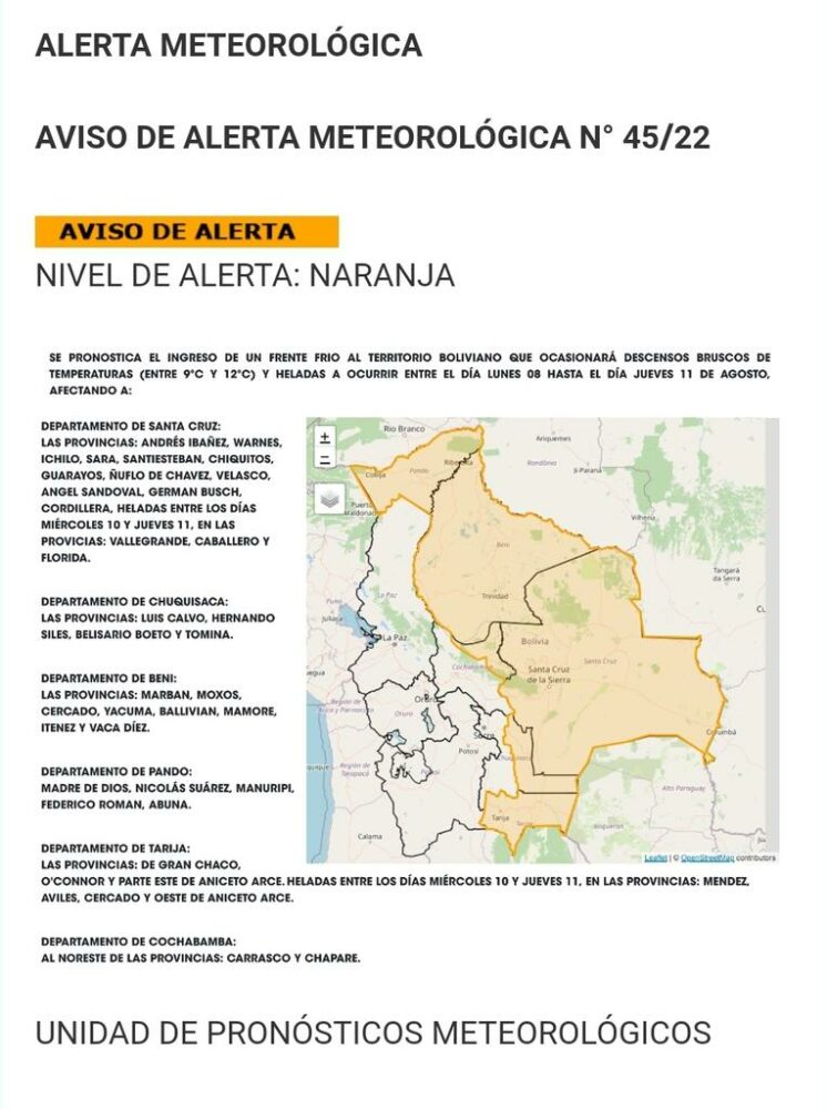 🔵 #ANF | El @SENAMHI_BOLIVIA reporta bajas temperaturas y heladas en seis departamentos del país hasta el día jueves 11 de agosto y emite una alerta naranja. https://t.co/GOVg0IxYpB
