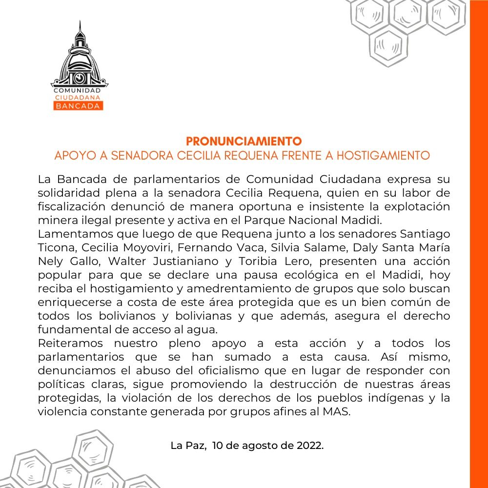 🔵 #ANF | #Política La Bancada de Comunidad Ciudadana manifiesta su apoyo a la senadora Cecilia Requena, quien estaría siendo hostigada y amedrentada por denunciar la explotación minera ilegal en el Parque Nacional Madidi. pic.twitter.com/5IfUpWjVI0